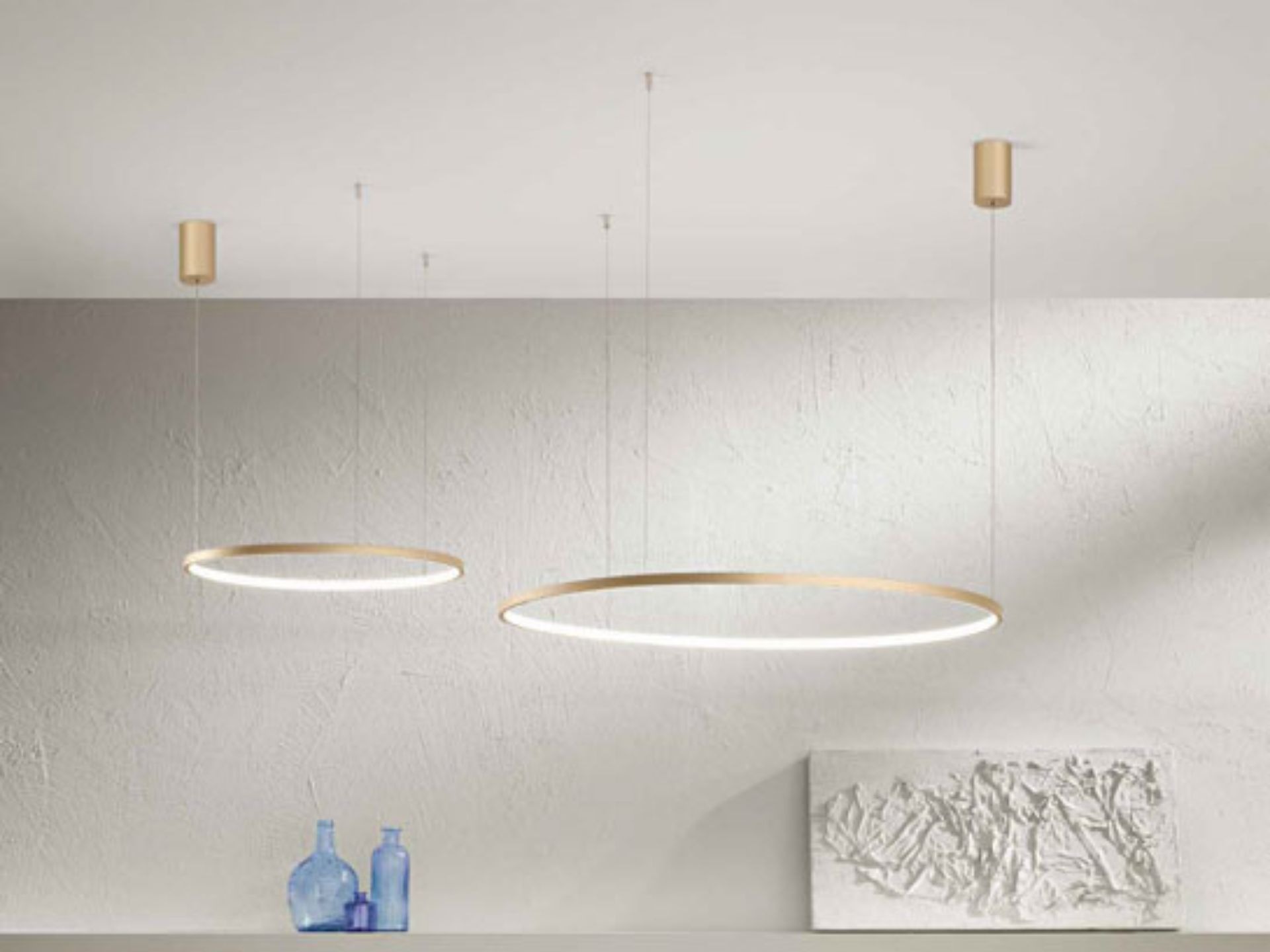 Il lampadario a sospensione SOEL, firmato da Ondaluce, è realizzato in metallo verniciato color oro ed è composto da due elementi ad anello di diverse dimensioni (60 cm e 80 cm), ognuno dei quali ha un diffusore in materiale polimerico orientato verso l'interno.Grazie ai supporti da soffitto, il SOEL offre grande flessibilità nell'installazione. I cavi regolabili permettono di variare l'inclinazione e la posizione degli anelli, consentendo di spostare il lampadario in modo più o meno decentrato rispetto al punto luce, a seconda delle vostre esigenze.La sorgente luminosa è costituita da un LED integrato con una potenza totale di 66 watt e tecnologia CCT, che consente di scegliere la temperatura del colore (3000K per luce calda o 4000K per luce naturale) al momento del montaggio tramite un interruttore integrato. Il flusso luminoso nominale è di 6600 lumen.Inoltre, l'intensità della luce può essere regolata installando un dimmer a parete, permettendo così di creare l'atmosfera desiderata per ogni occasione.Il design circolare e la finitura dorata donano al lampadario un aspetto elegante e sofisticato, rendendolo un punto focale in qualsiasi ambiente. È perfetto per arredare con stile e offrire un'illuminazione calda e accogliente a un salone o soggiorno moderno. Questo lampadario è versatile e originale, con un eccellente rapporto qualità-prezzo, ed è adatto anche per ambienti commerciali come hotel, ristoranti e uffici.È disponibile anche nella versione bianca e in varianti singole, per offrire la possibilità di scegliere la soluzione più adatta al proprio spazio.