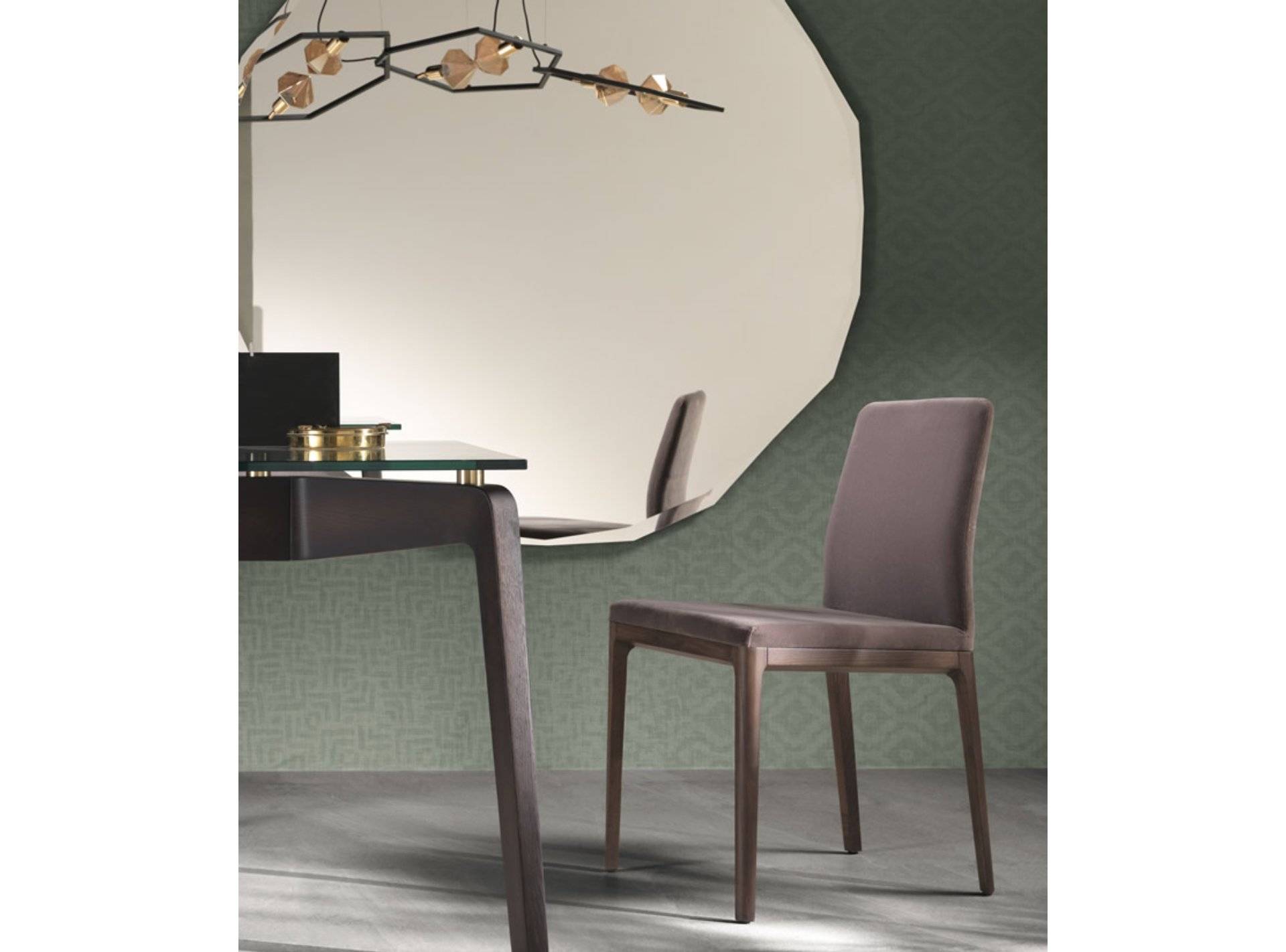 Specchio con cornice perimetrale con bisellatura irregolare. Disponibile in cristallo specchiante o bronzato. Dimensioni: 120 cm oppure 150 cm